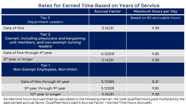 BMH provides employees time off with pay for vacation, holidays, personal days and sick days through the earned time benefit.  The amount of earned time accrued is based on accruable hours worked. Employees must have 48 accruable hours or more per pay period to accrue earned time.