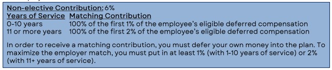 To qualify, you must work at least 250 during the plan year. All compensation earned during that year will be credited. If you do not work 250 hours in the plan year, you will not receive a match or the non-elective contribution.